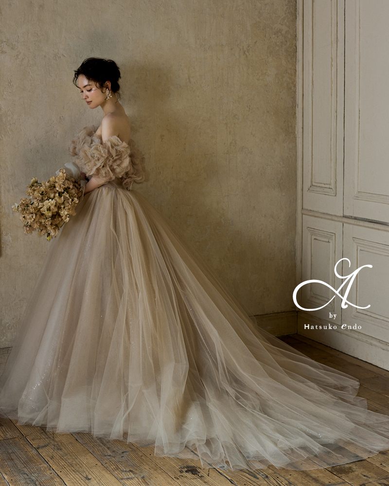 こぼれ落ちるようなイメージで配置されたオフショルダーのコサージュがデコルテを飾ります。